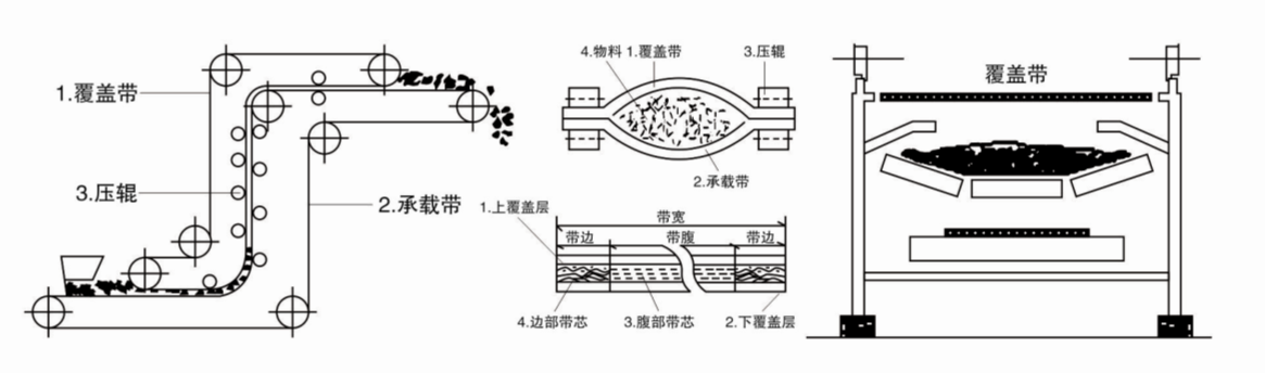 覆蓋密封輸送帶為輸送系統遮蓋了環境的灰塵、水、風。骨架層采用的是特殊的尼龍織物、鋼絲簾線層等,不僅具有優良的縱向彈性,也有優良的橫向剛性,因此廣泛應用在卸料機、回收裝置、自動卸料輸送機等。