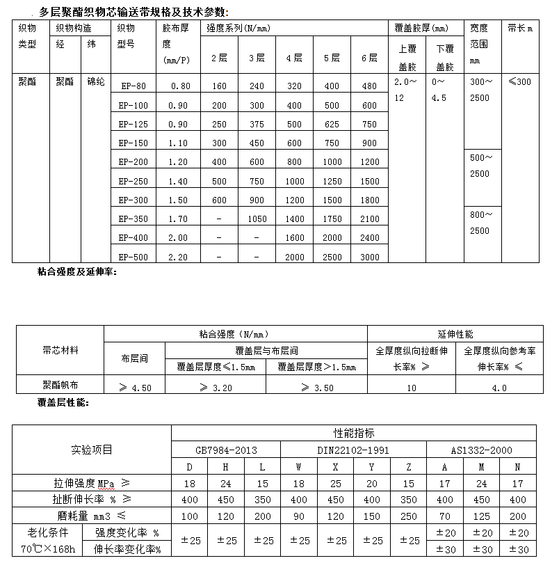 Polyester conveyor belt, also known as EP conveyor belt, is made of polyester canvas interwoven with warp polyester and weft nylon as its skeleton material. Its performance characteristics include low elongation in the warp direction and excellent grooving performance in the weft direction, good water resistance, no decrease in wet strength, no mildew, and high initial modulus. It is suitable for conveying materials under medium to long distance, high load, and high-speed conditions.
